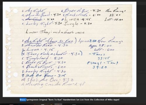 There’s a bunch of handwritten song lists and inventories that have floated around the internet, some from auction sites – if you saw the Springsteen exhibit at the Rock and Roll Hall of Fame, there were several there that I wish I had spent the time to catalog instead of just gawking at – and while these aren’t dated and we don’t have any kind of chain of custody to know what they were used for and what he was thinking when he wrote them down, there is one that solidifies this theory about the connection between “A Love So Fine” and “Night.”